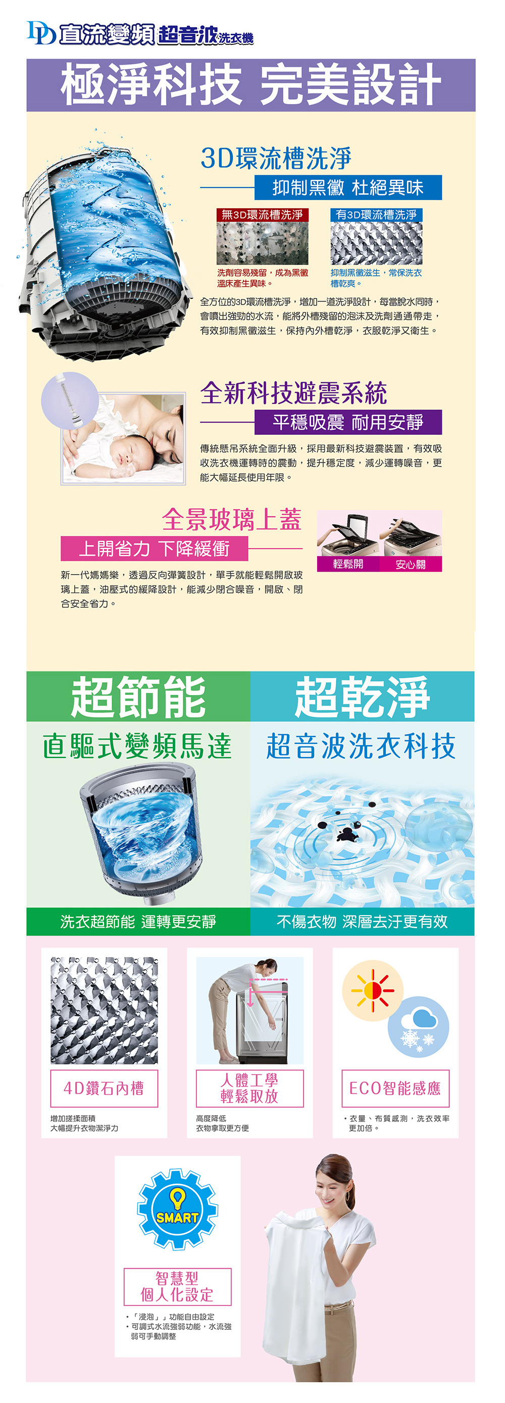 | 洗衣行程選擇 | 標準、污髒、快速、記憶、毛毯、柔洗、護嬰、槽洗淨 | |