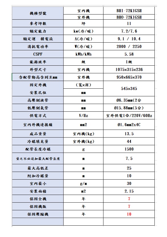 華菱 精緻時尚「變頻」一級冷暖 / BHI-72KIGSH/BHO-72KIGSH 冷房能力:7.2kW, 參考坪數:11坪