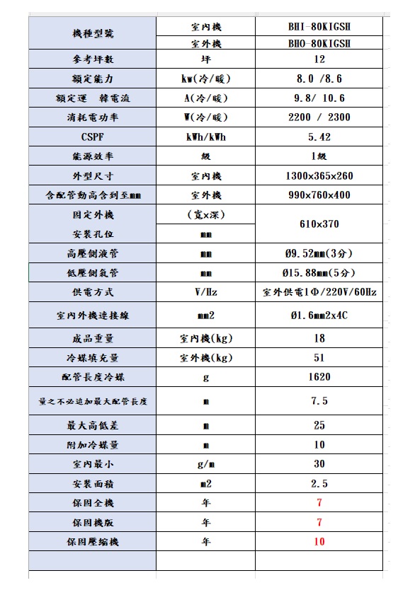 華菱 精緻時尚「變頻」一級冷暖 / BHI80KIGSH/BHO-80KIGSH 冷房能力:8.0kw, 參考坪數:12 坪