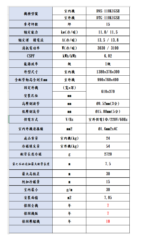 華菱 精緻時尚「變頻」一級冷暖 / DNS-110KIGSH/DTG-110KIGSH 冷房能力:11kW, 參考坪數:15坪