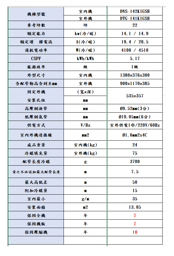 華菱 精緻時尚「變頻」一級冷暖 / DNS-141KIGSH/DTG-141KIGSH 冷房能力:14.0kw, 參考坪數:22坪