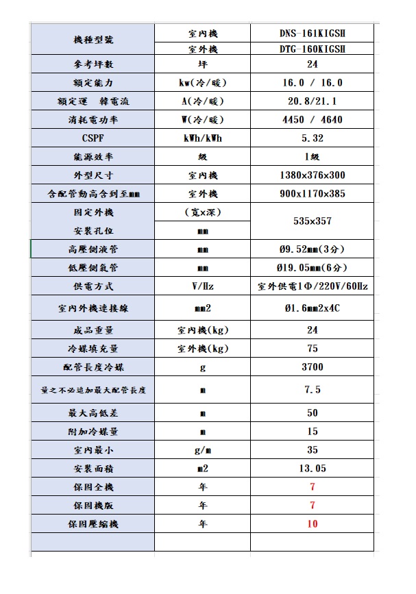 華菱 精緻時尚「變頻」一級冷暖 / DNS-160KIGSH/DTG-160KIGSH 冷房能力:16.0kw, 參考坪數:24坪