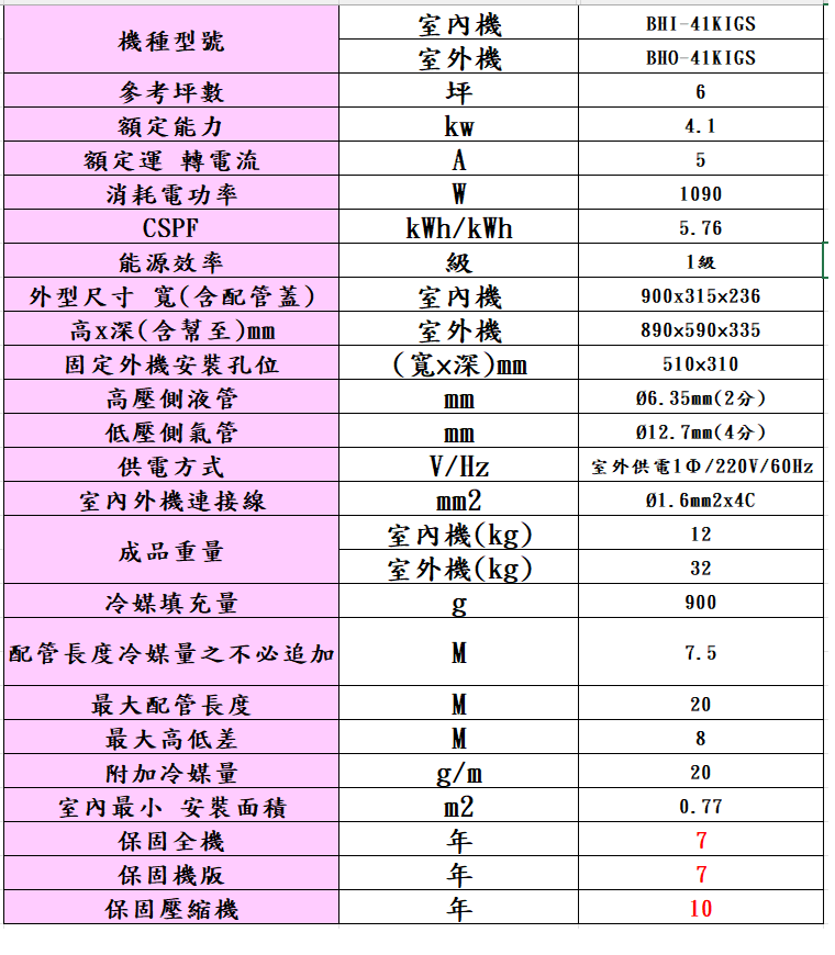 華菱 精緻超值「變頻」一級冷專 / BHI-41KIGS/BHO-41KIGS 冷房能力:4.1kW, 參考坪數:6坪