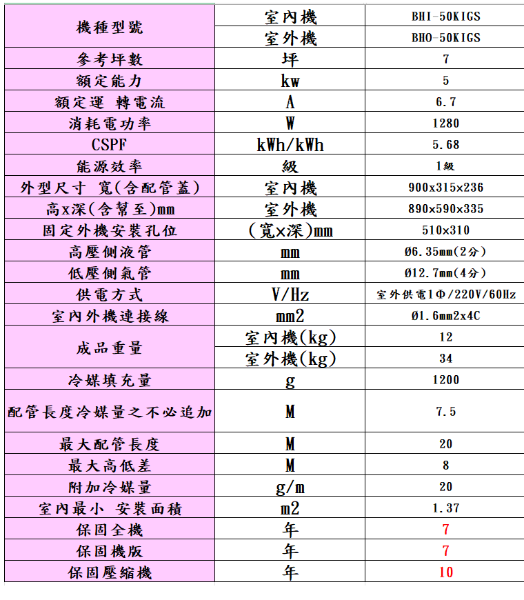 華菱 精緻超值「變頻」一級冷專 / BHI-50KIGS/BHO-50KIGS 冷房能力:5.0kW, 參考坪數:7坪