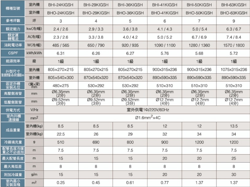華菱 精緻時尚「變頻」一級冷暖 / BHI-63KIGSH/BHO-63KIGSH 冷防能力:6.3kW, 參考坪數:9坪