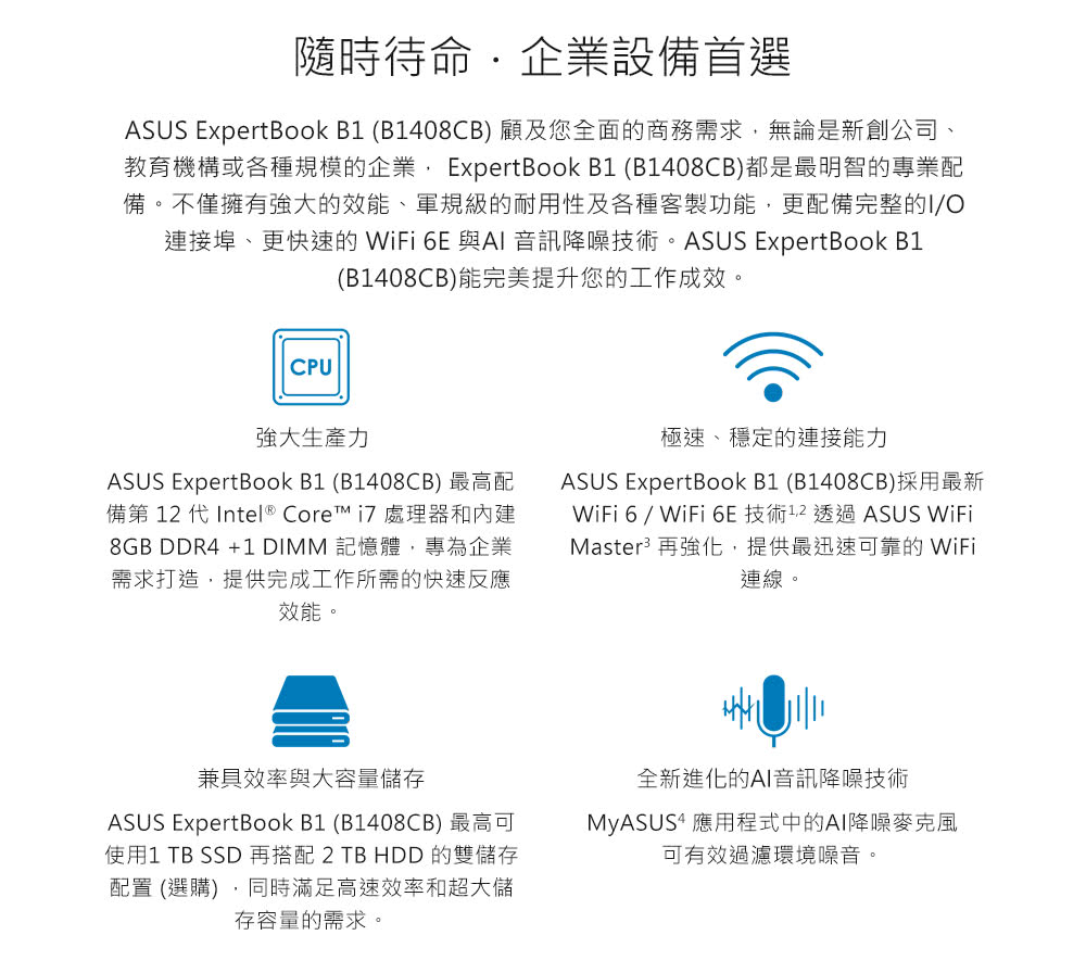 ASUS ExpertBook B1 顧及您全面的商務需求,無論是新創公司、教育機構或各種規模的企業, ExpertBook B1都是最明智的專業配備。不僅擁有強大的效能、軍規級的耐用性及各種客製功能,更配備完整的I/O連接埠、便利的指紋辨識功能、更快速的 WiFi 6 與最新AI 音訊降噪技術。ExpertBook B1能完美提升您的工作成效。