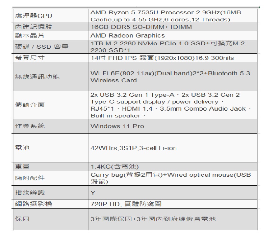 - 品 名: BM1403CDA/14 FHD IPS/R5-7535U/16G/1T SSD/Wi-Fi6E/Win11Pro/3Y