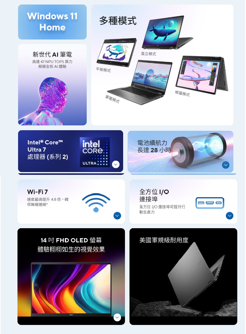 專為簡化工作流程與顛覆既有的工作方式設計,擁有 360° 可翻轉的螢幕轉軸,提供極致靈活性,並支援 ASUS Pen 2.01,輕鬆滿足您的需求。搭載最新 Intel® Core™ Ultra 7 處理器 (系列 2),擁有高達 47 TOPS 的 NPU 算力,還配備令人驚艷的 14 吋 FHD ASUS Lumina OLED* NanoEdge 觸控螢幕。此外,電池續航力最高可達 28 小時2,支撐您連續多天的工作需求。這台筆電是學生和專業人士的最佳選擇,讓您的生產力達到前所未有的高度。