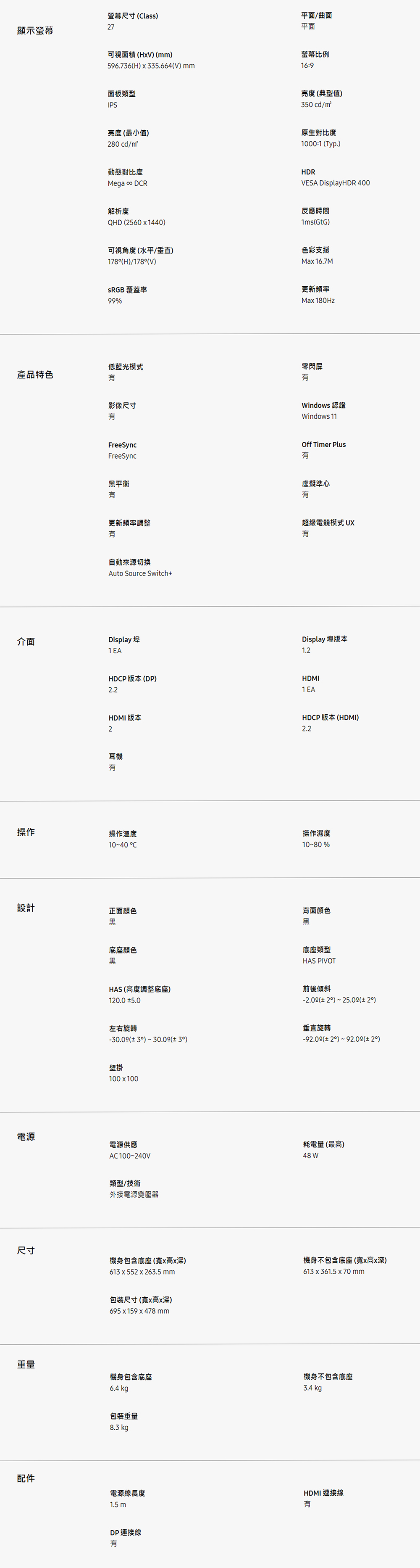 三星SAMSUNG S27DG502EC Odyssey G5 2K180Hz 1ms可升降旋轉IPS電競螢幕