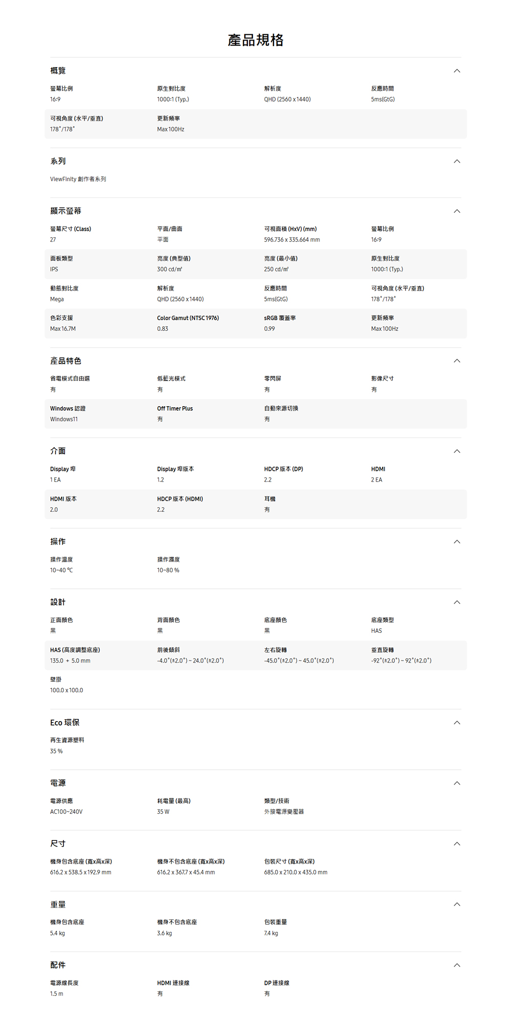 J0069434 三星SAMSUNG S27F612EAC ViewFinity S6 2K 100Hz旋轉升降創作者色彩專業螢幕
