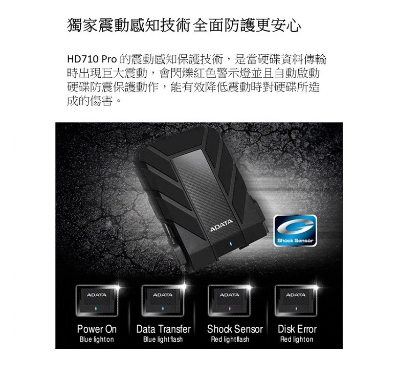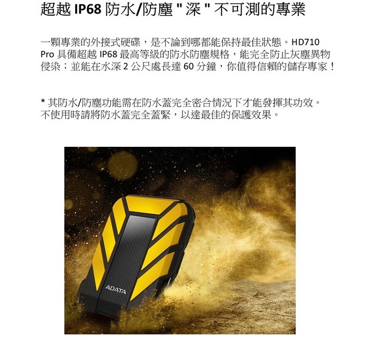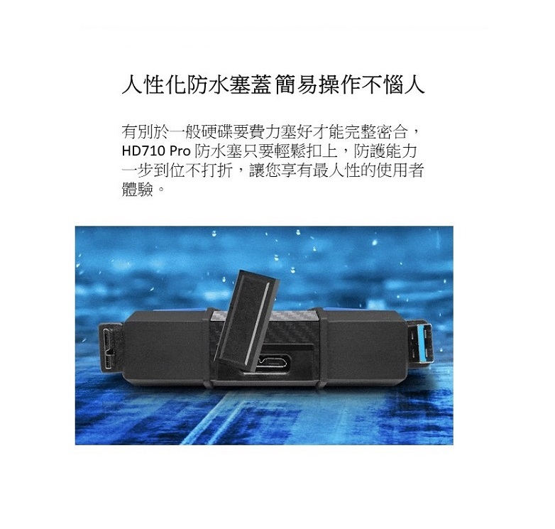 沒有頂級,只有不斷超越!HD710 Pro 外接式硬碟具備超越 IP68 等級的優異防水/防塵能力,由內到外流竄強悍基因,三層特殊抗震材質、通過軍規落摔考驗,嚴密防護重要資料。高達 2TB 的容量,展現儲存眾多資料的大器,剽悍富視覺動感的造型,撼動你沉潛深處的渴望!