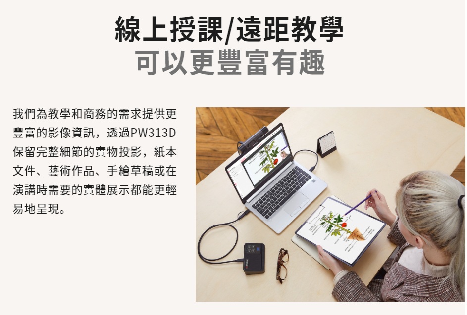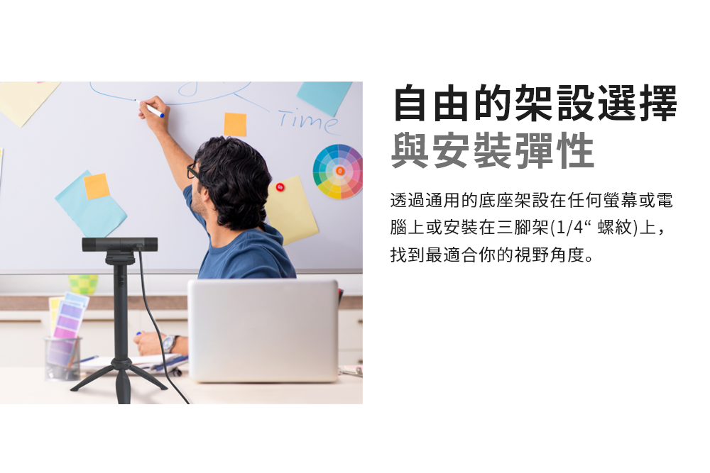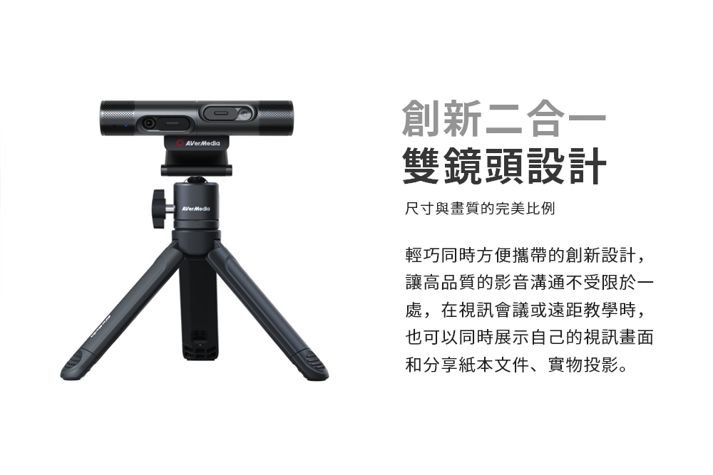 • 雙鏡頭設計:一個鏡頭拍攝人像,另一個可拍攝書寫筆記、投影片或實物,適合教師、講師使用。