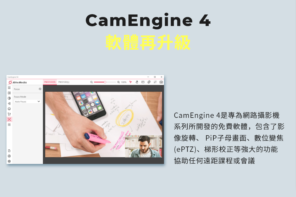 • 遠距會議時,同時展示白板/產品與自己的影像