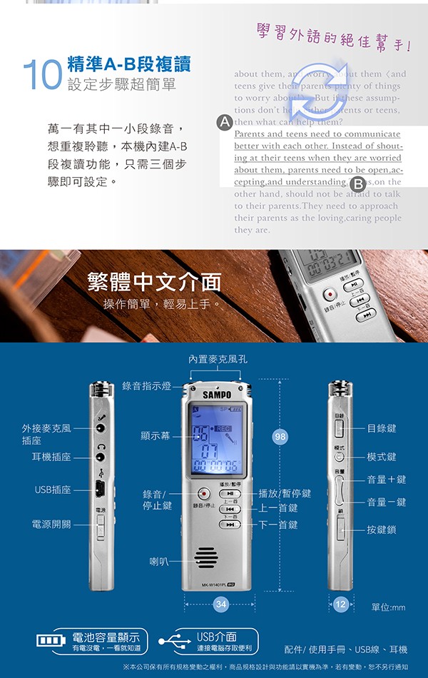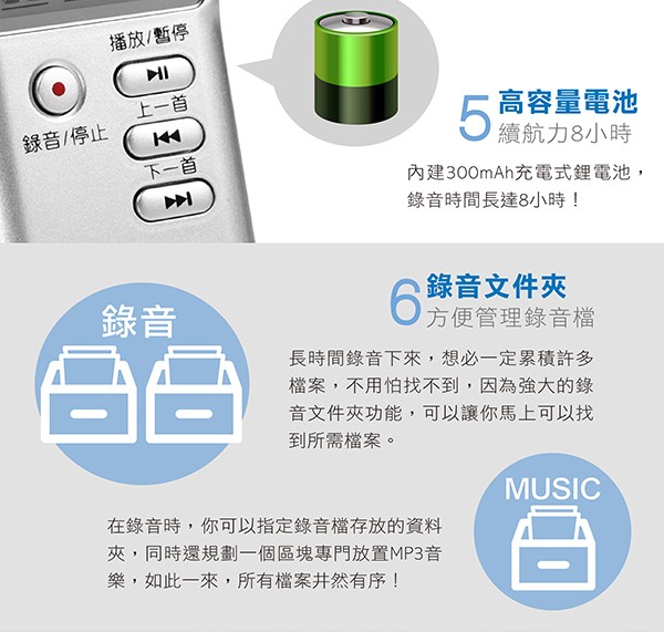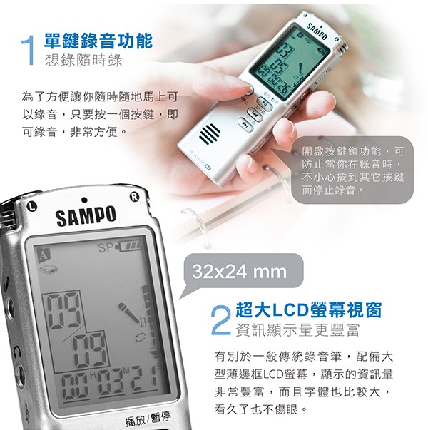 • 按鍵鎖定功能:防止誤觸,提高錄音可靠度 。