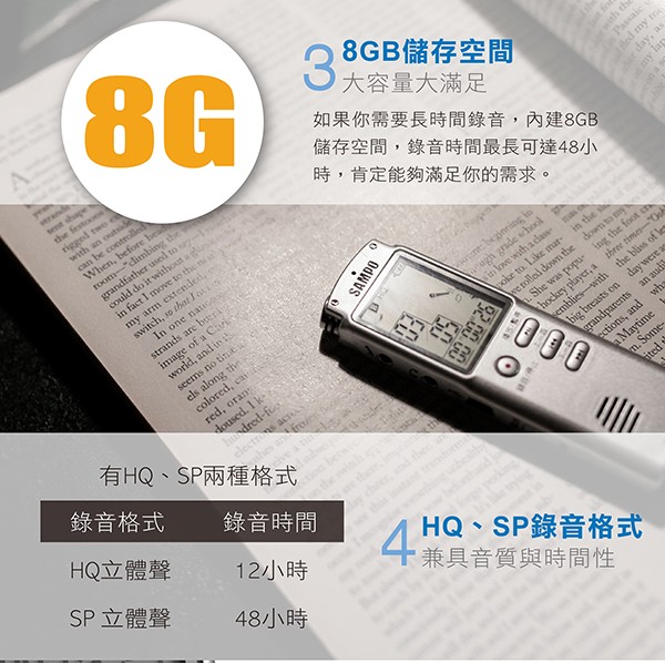 • 內建 8GB 儲存空間:不需外接卡片即可錄音,可存放數十小時音檔 。