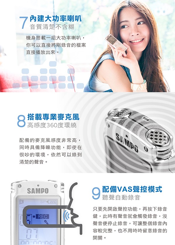 • 支援 VAS 智慧聲控錄音:安靜時自動停止錄製,節省空間,並在偵測到聲音時重新錄音 。