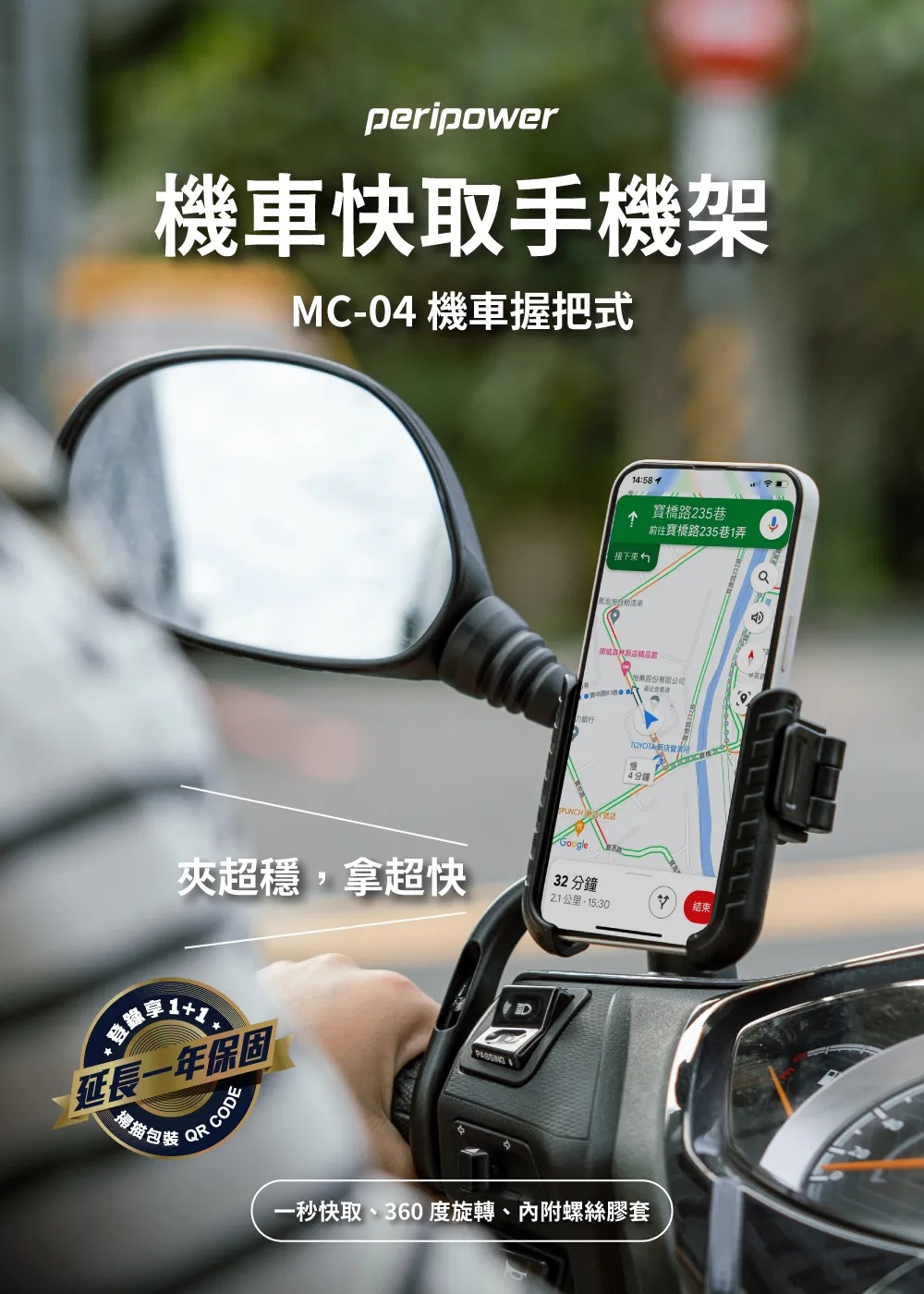 採用 鋁合金本體,結構堅固耐用,不易搖晃,適合台灣各類路況,無論是市區顛簸或山區彎道都能穩穩支撐手機。