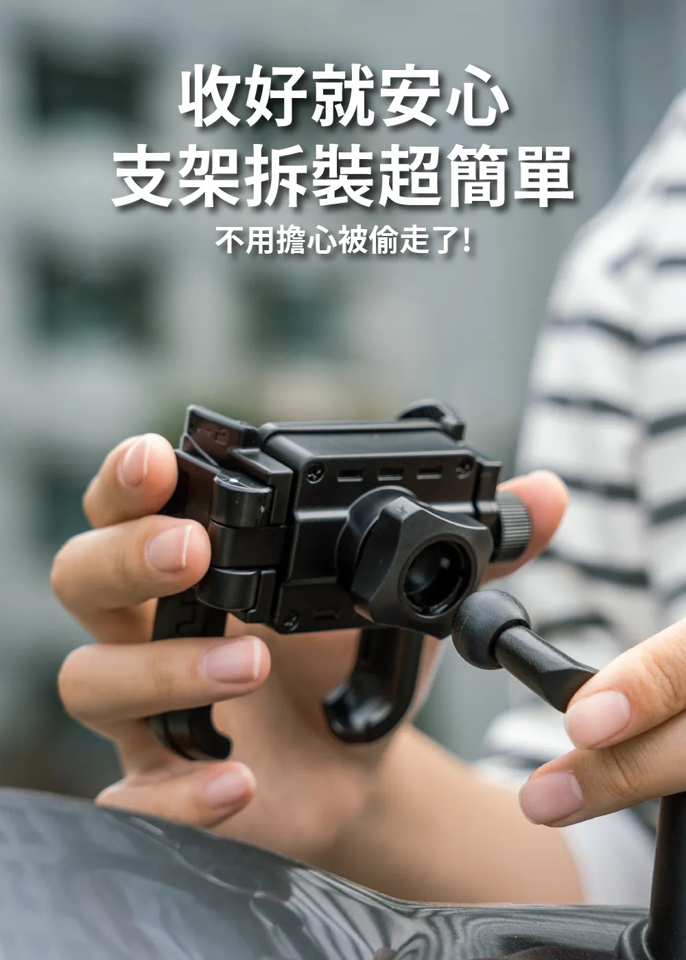 U 型快取手機夾設計,讓你在停紅燈或出發前能 一手快速放置或取下手機,省時又方便,騎士友善設計。