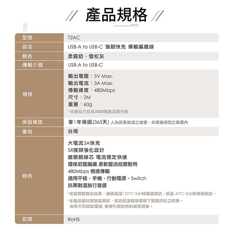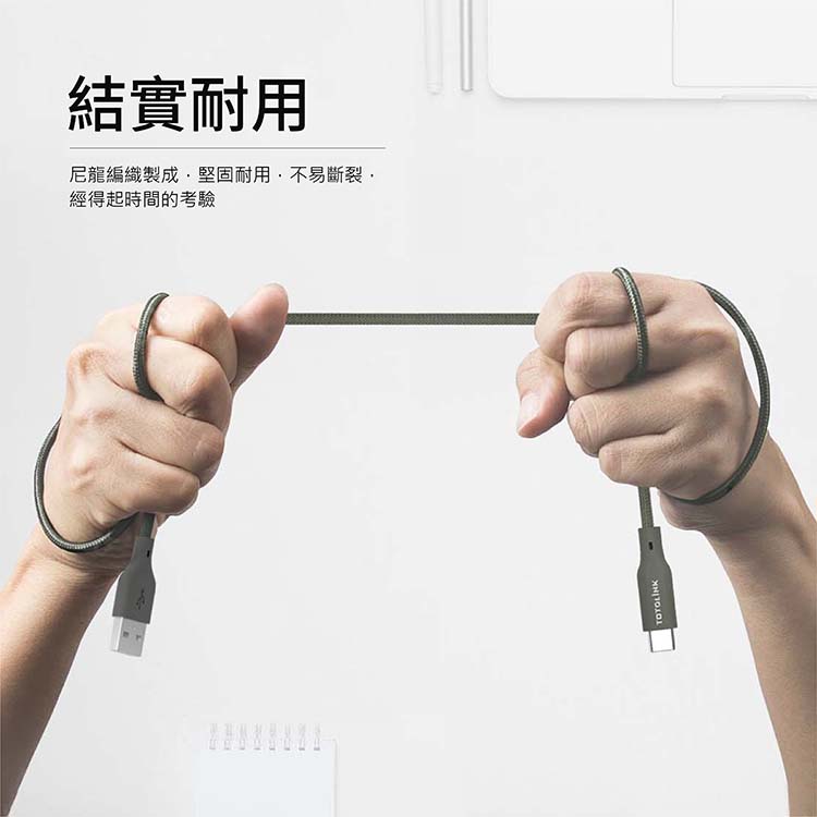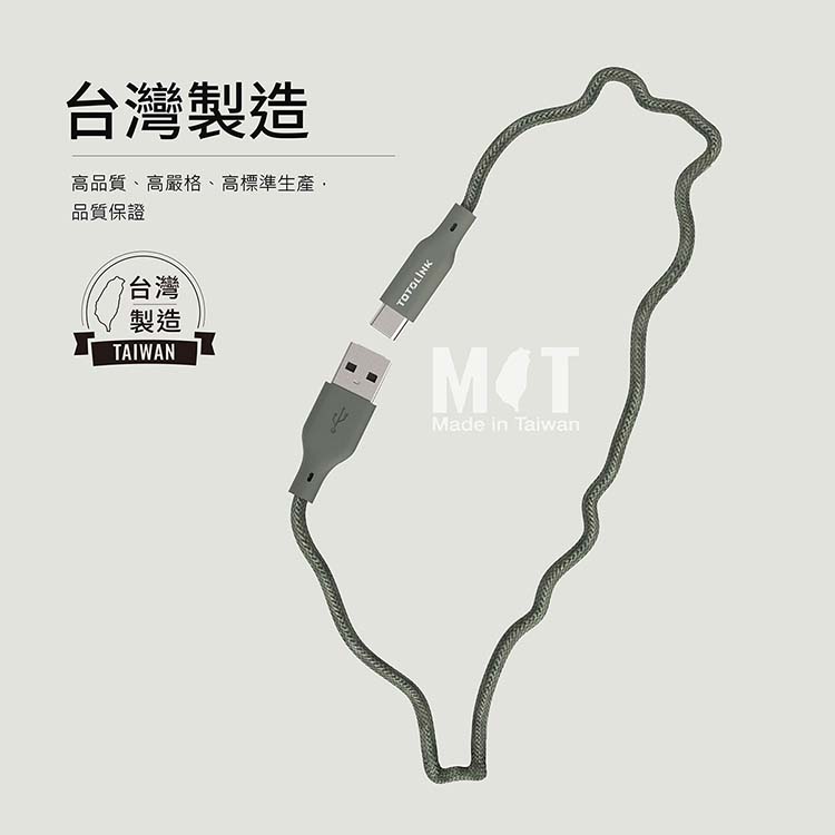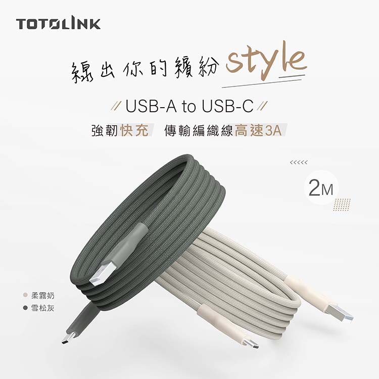 TOTOLINK USB-A-C快充傳輸線-柔霧奶 2米 雪松灰 1米
