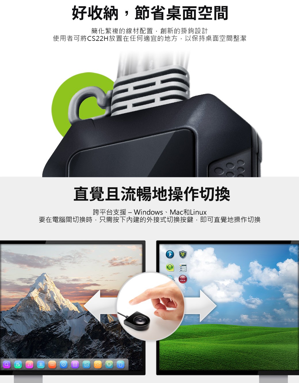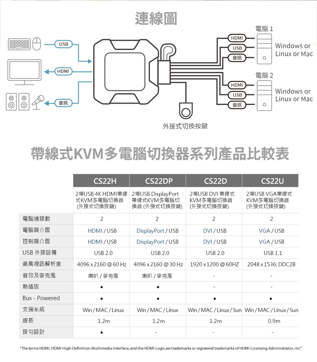 ATEN CS22H 2埠USB 4K HDMI帶線式KVM多電腦切換器 (外接式切換按鍵)