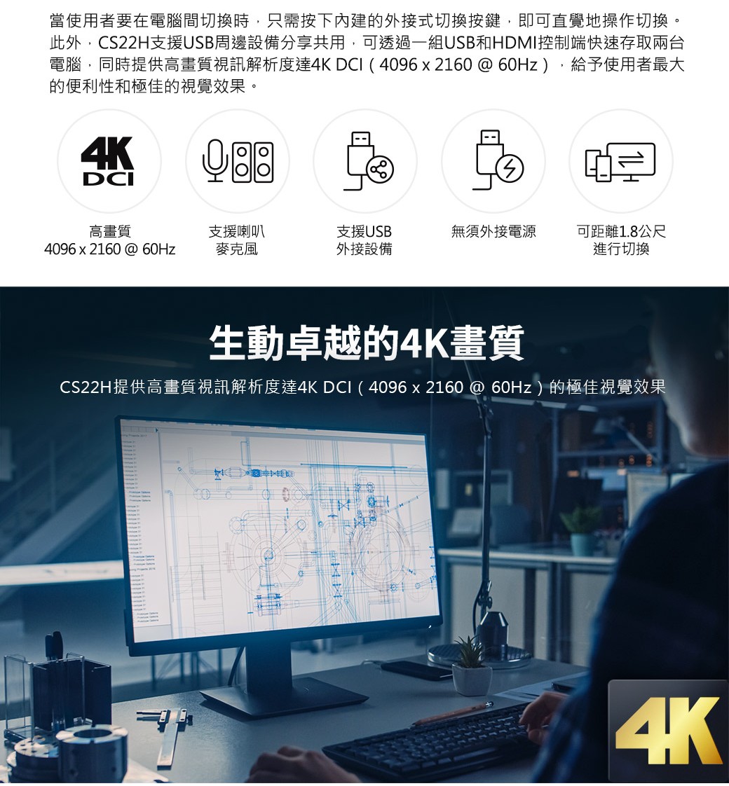 ATEN 2埠USB 4K HDMI帶線式KVM多電腦切換器