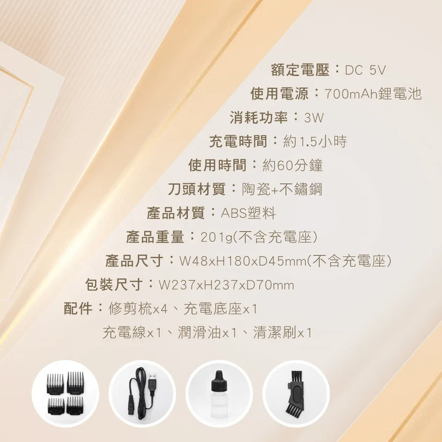 配件:修剪梳x4、充電底座x1、充電線x1、潤滑油x1、清潔刷x1