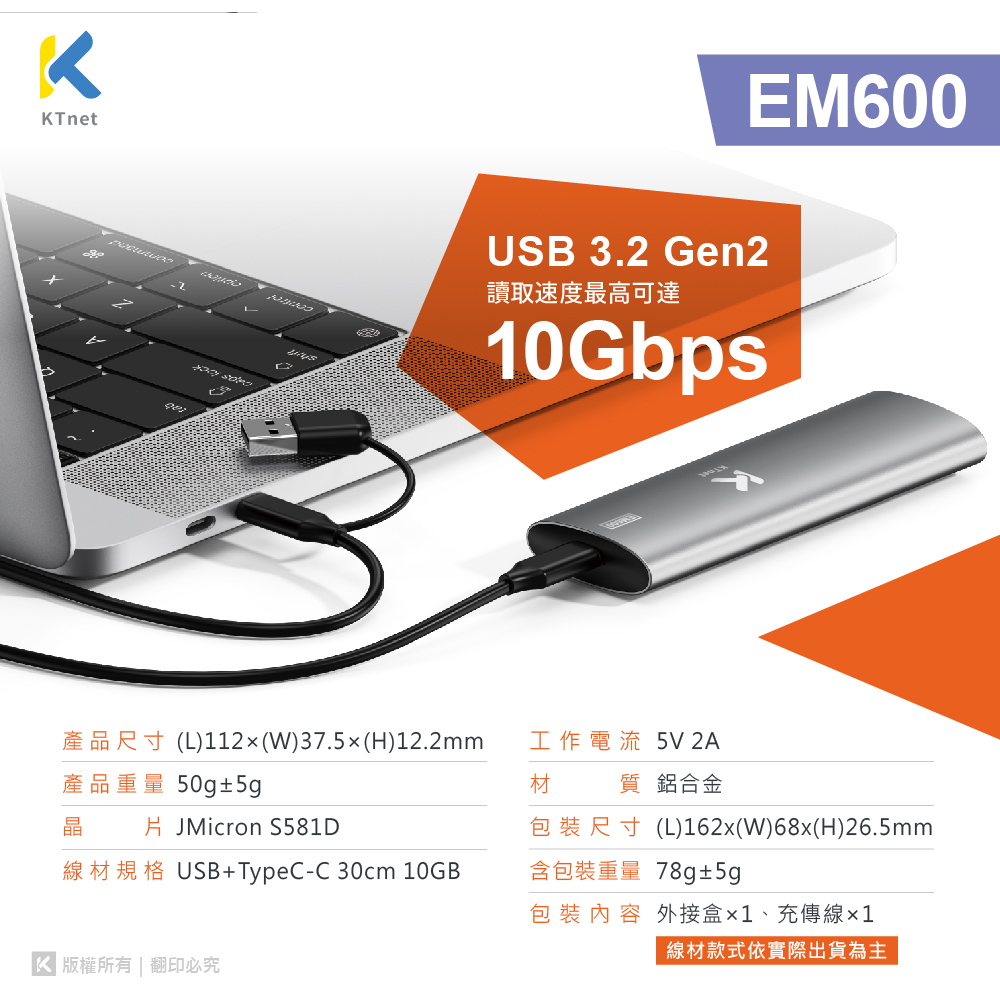 【KTnet】EM600 M,2 SSD NVME/ SATA 雙協議鋁合金外接盒
