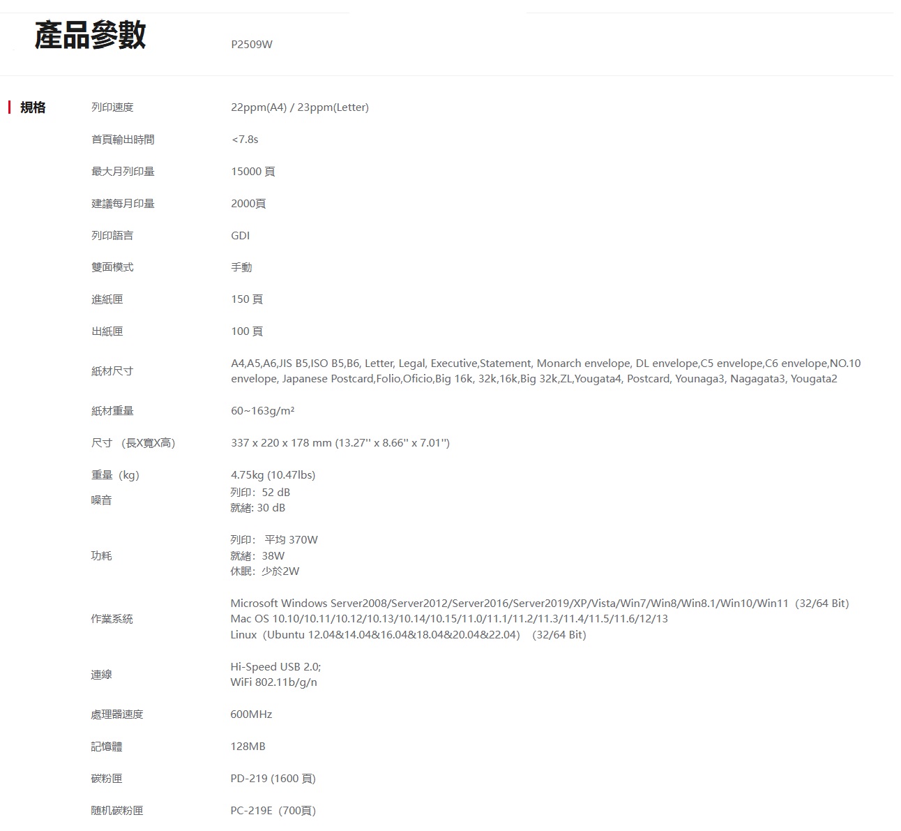 ※ 使用碳粉匣型號:PD-219