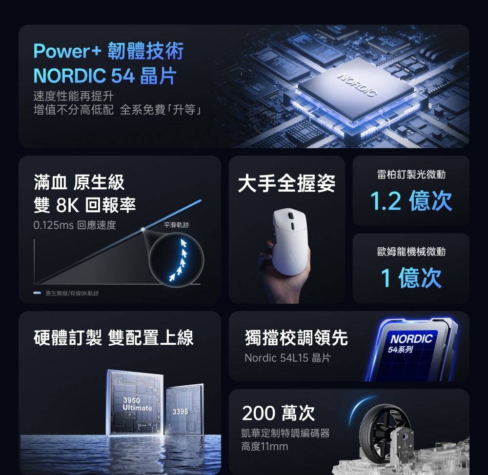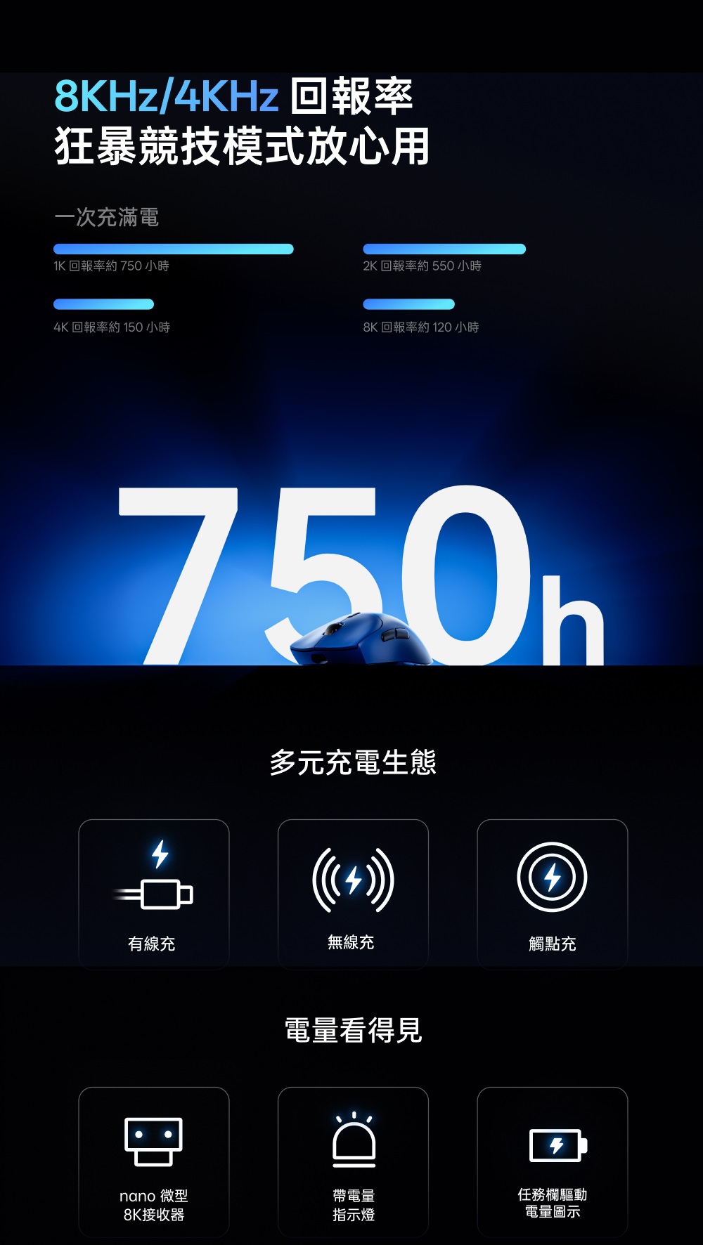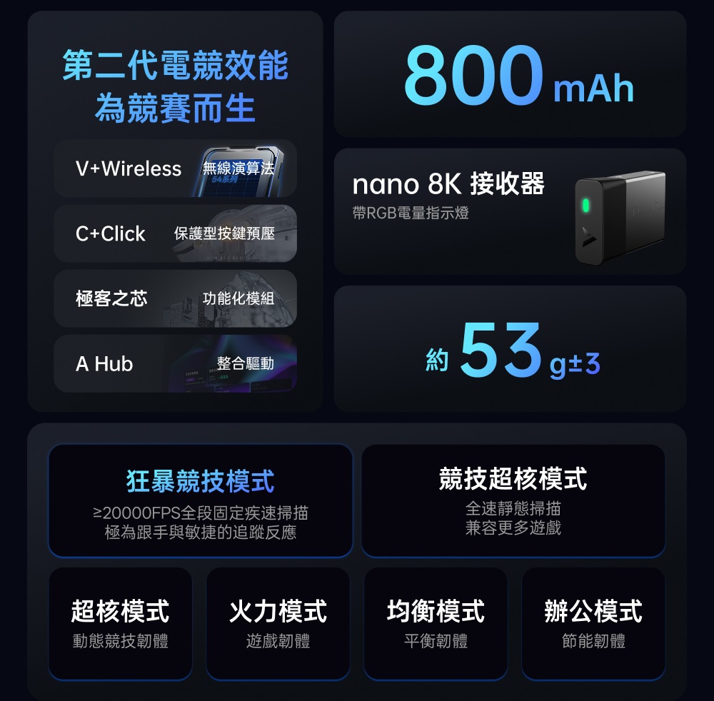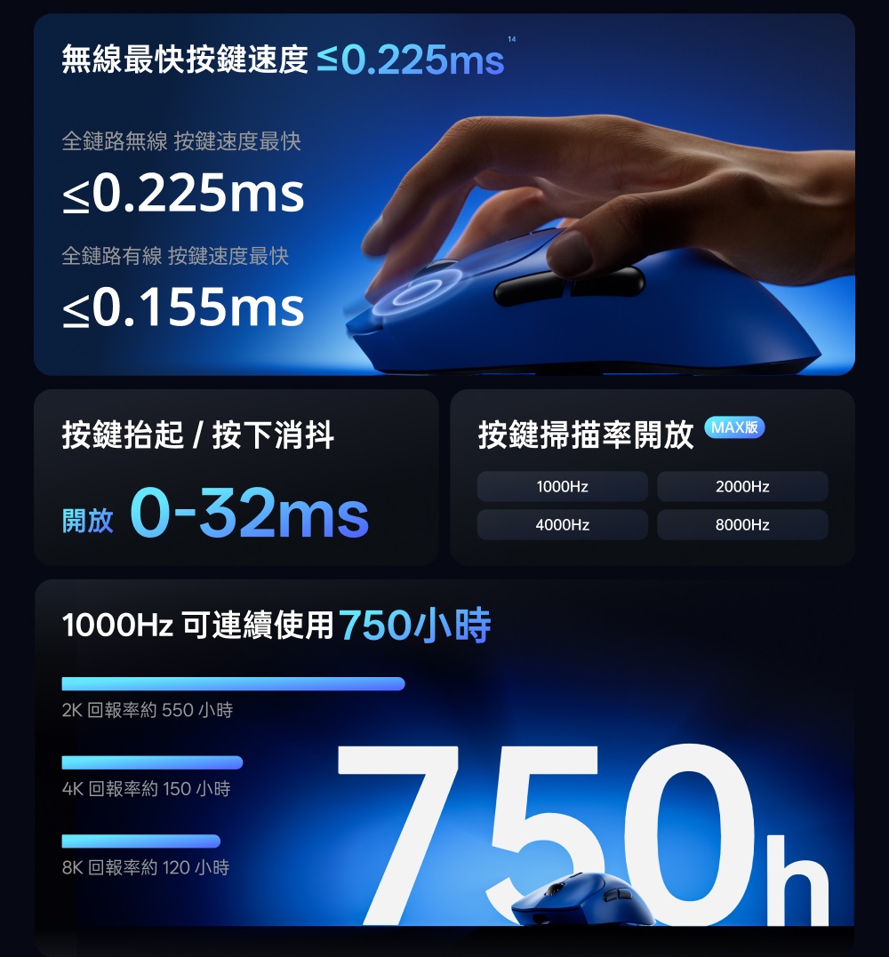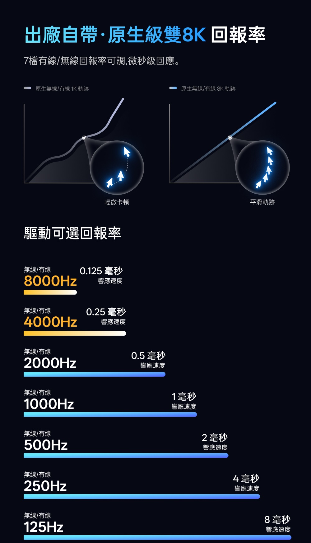 ‑ 支援高達 8000 Hz 無線回報率(native 8K),反應更快、更穩定,適合需要極速操控的競技遊戲。