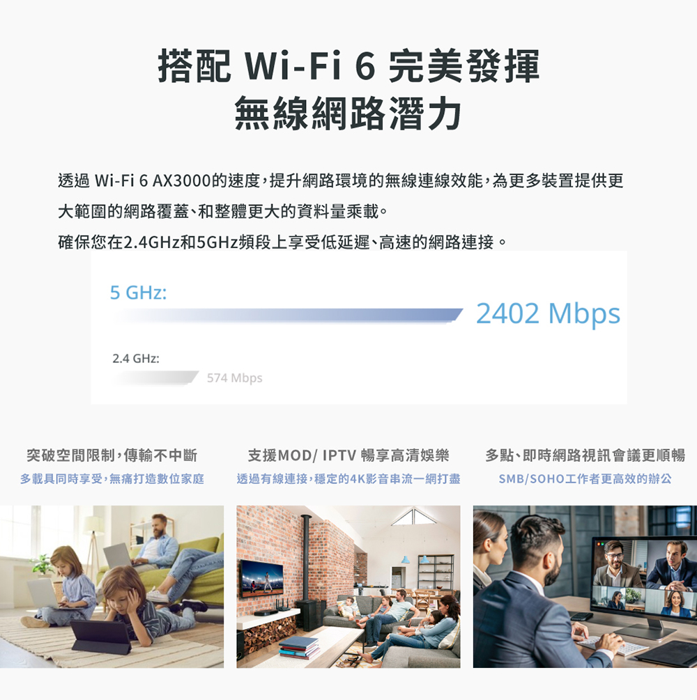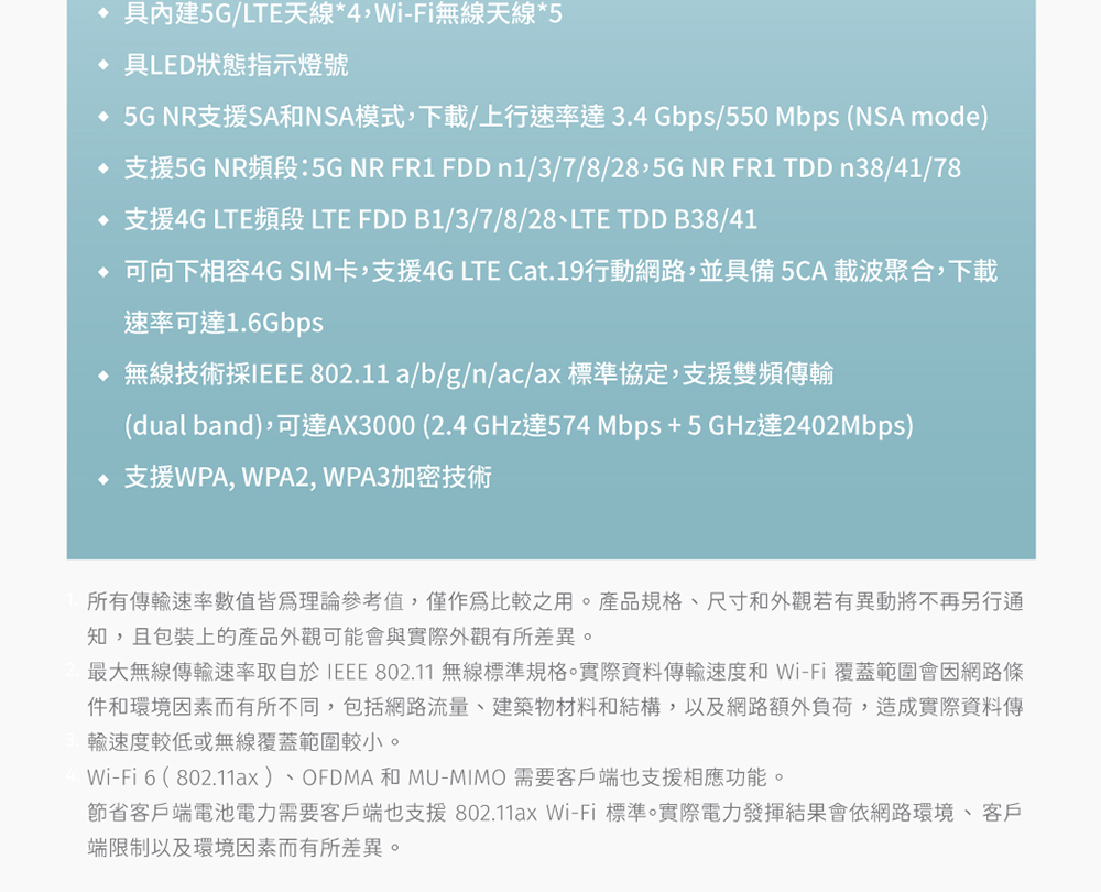 •無線技術採IEEE 802.11 a/b/g/n/ac/ax 標準協定,支援雙頻傳輸(dual band),可達AX3000 (2.4 GHz達574 Mbps +5 GHz達2402Mbps)