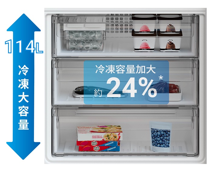 - 大容量下層冷凍 較同級機型冷凍加大約24%