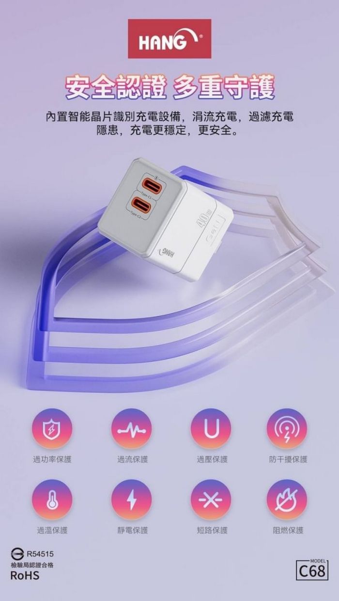 HANG C68(PDQCPPS)40W快速充電器*1-BSMI認證:R54515
