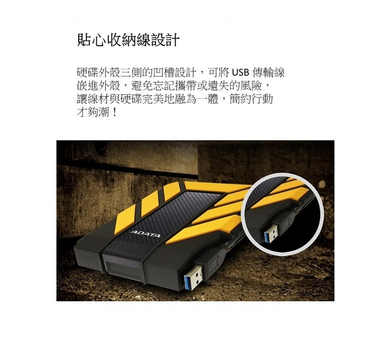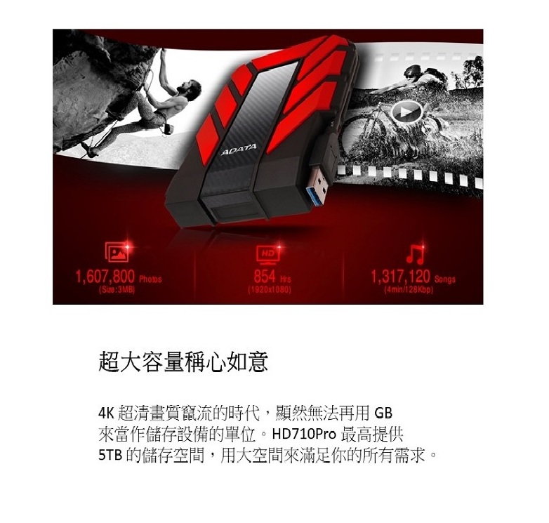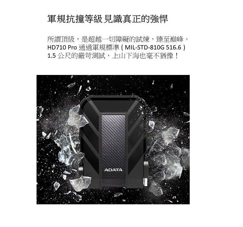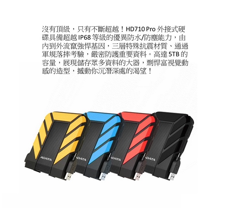 沒有頂級,只有不斷超越!HD710 Pro 外接式硬碟具備超越 IP68 等級的優異防水/防塵能力,由內到外流竄強悍基因,三層特殊抗震材質、通過軍規落摔考驗,嚴密防護重要資料。高達 2TB 的容量,展現儲存眾多資料的大器,剽悍富視覺動感的造型,撼動你沉潛深處的渴望!