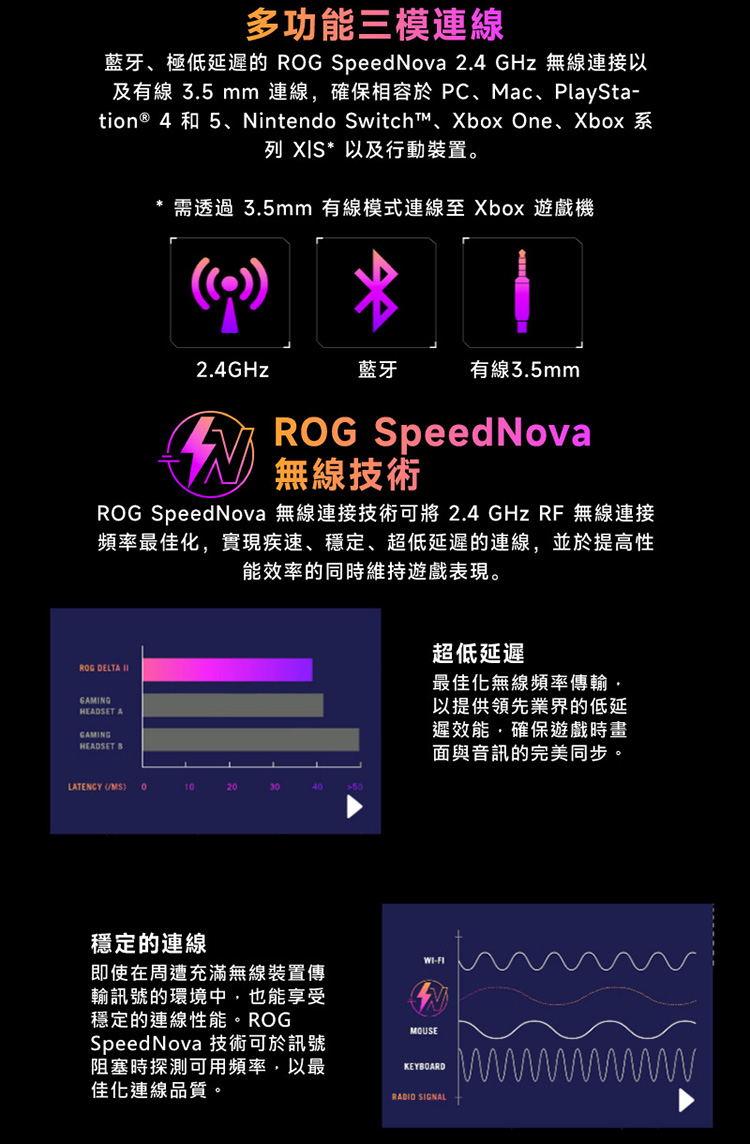 ❤️三模連線功能:具備藍牙® 2.4 GHz RF 搭配 ROG SpeedNova 無線技術與有線 3.5 mm 連接,提供與電腦、遊戲機和行動裝置等多設備類型的全面相容性
