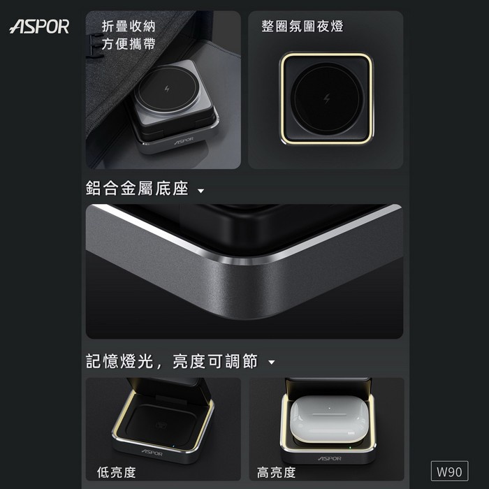 ASPOR W90 22W小魔方摺疊三合一磁吸無線充電座 可調節氛圍燈(手機/智慧手錶/耳機無線充電)
