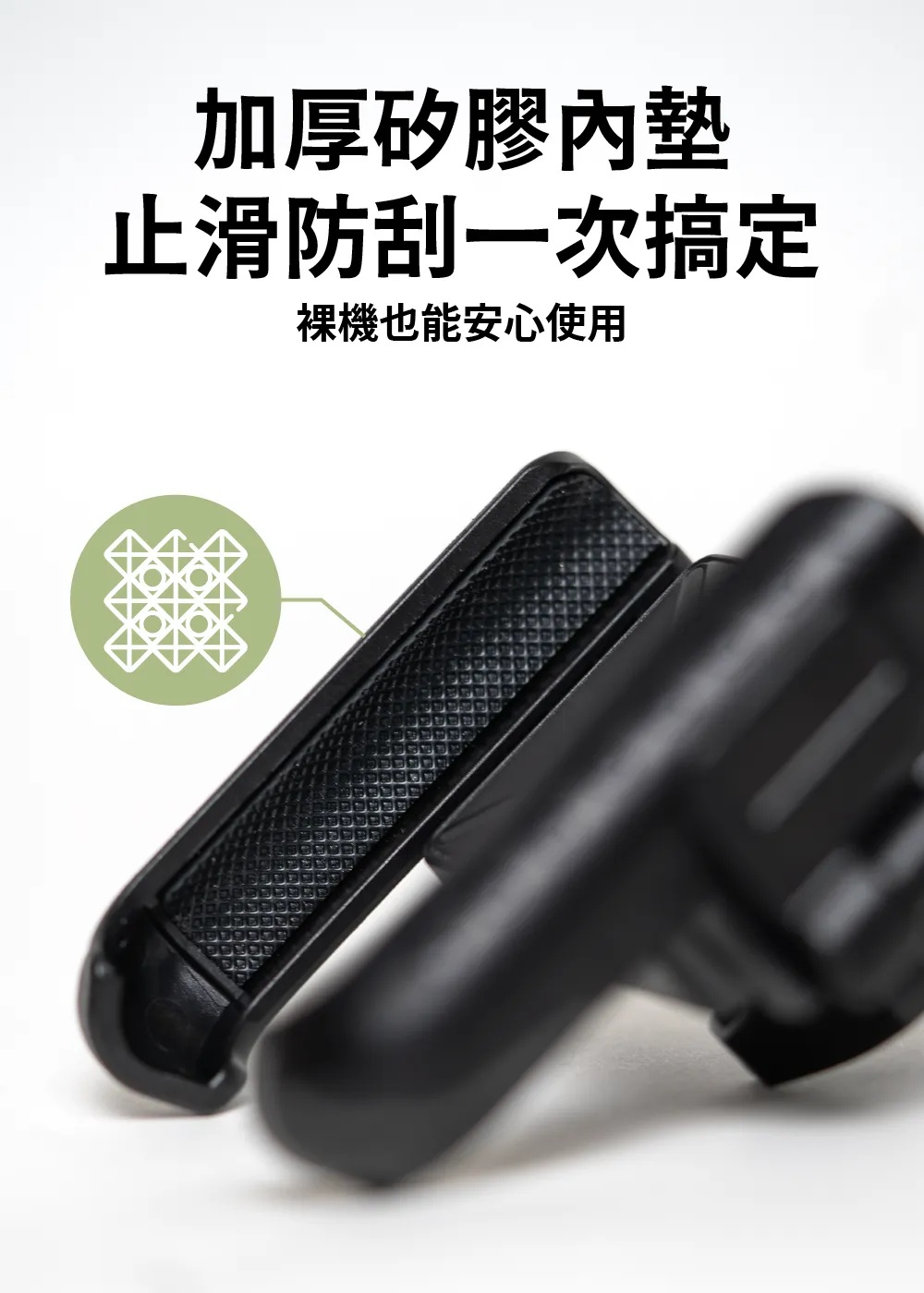 支架夾具內側附有止滑膠墊,保護手機不被刮傷,同時提升摩擦力,騎乘穩定更安心。