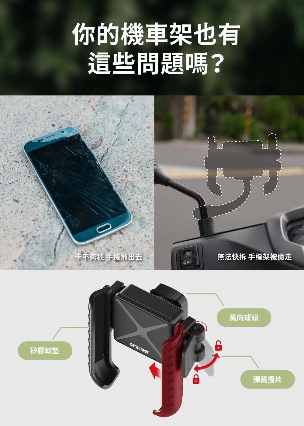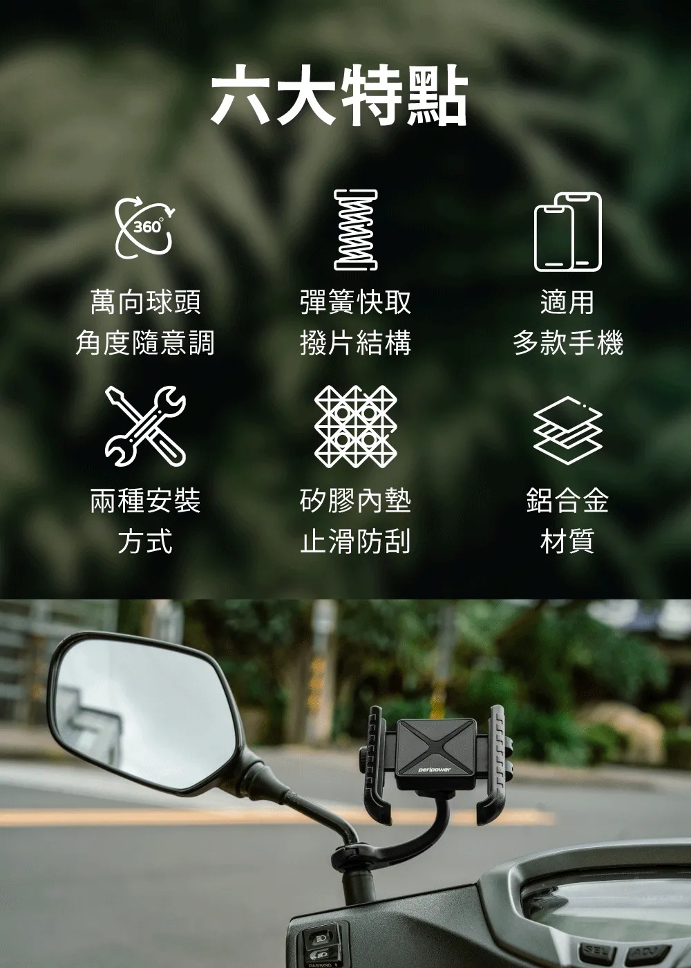 採用 鋁合金本體,結構堅固耐用,不易搖晃,適合台灣各類路況,無論是市區顛簸或山區彎道都能穩穩支撐手機。