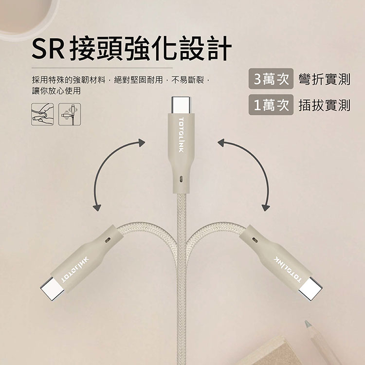 TOTOLINK USB-A-C快充傳輸線-柔霧奶 2米 雪松灰 1米