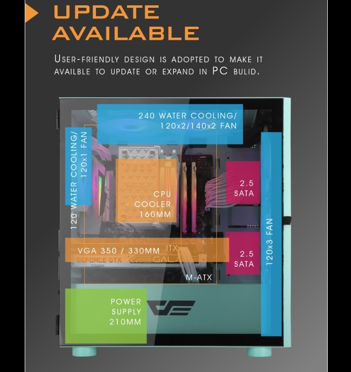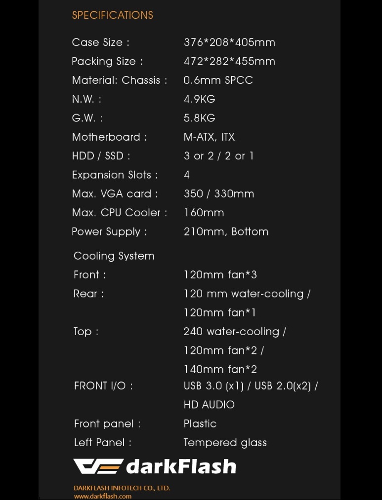 風扇散熱: 前方:120 mm風扇x 3 後方:120 mm水冷 / 120 mm風扇x 1 上方: 240 mm水冷 / 120 or 140 mm風扇x 2