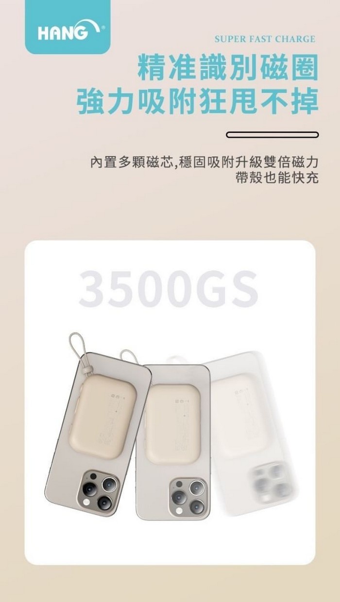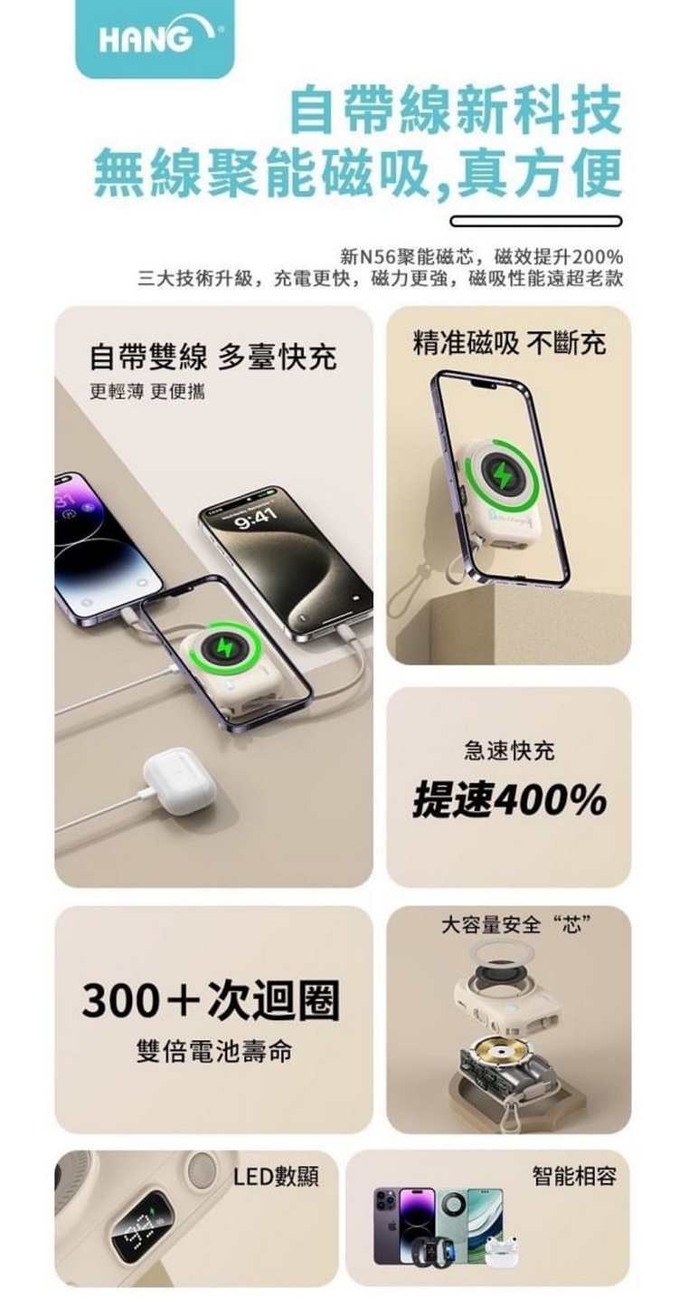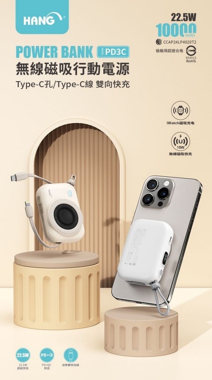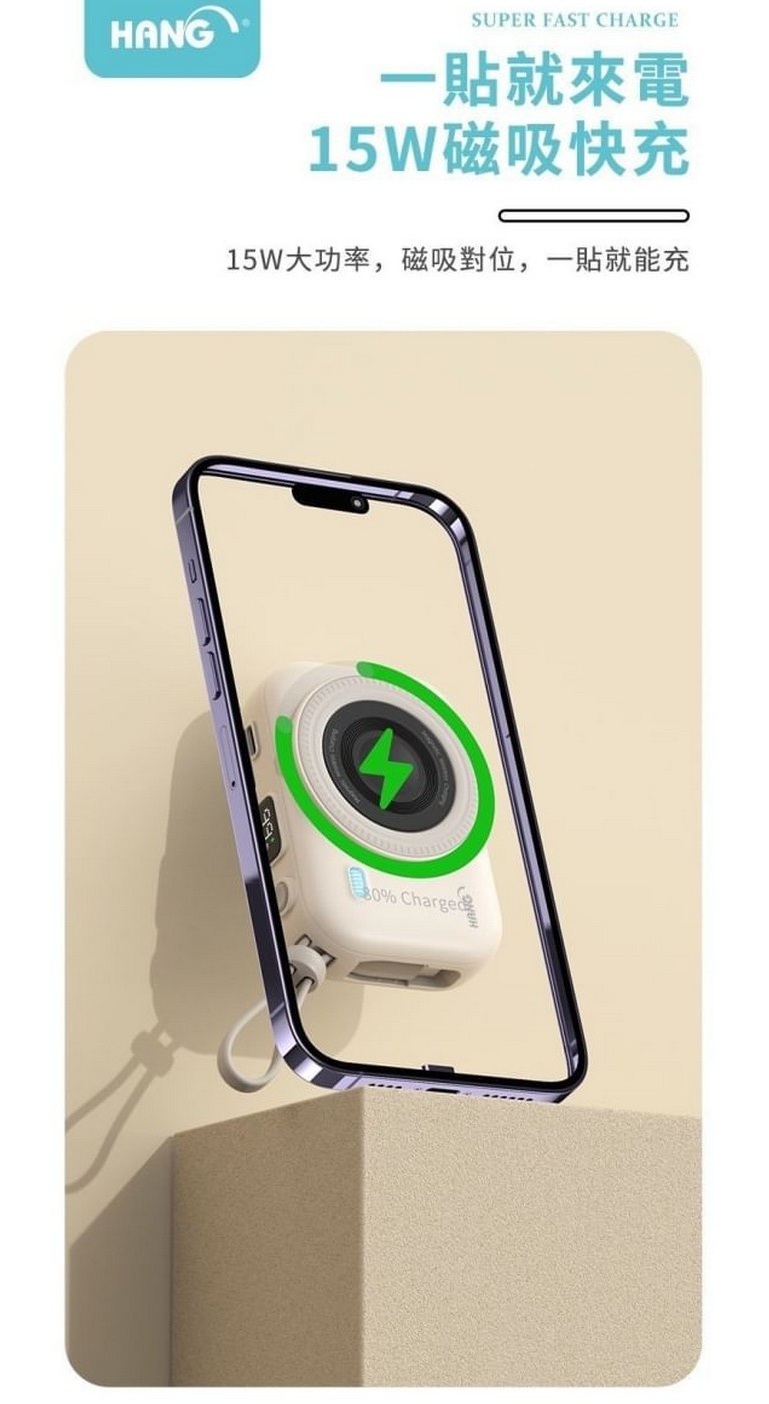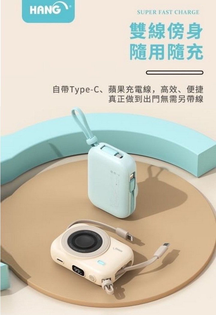 HANG-PD3C 無線磁吸自帶雙線10000mAh行動電源 七合一 自帶線 磁吸 行充 充電寶 掛繩