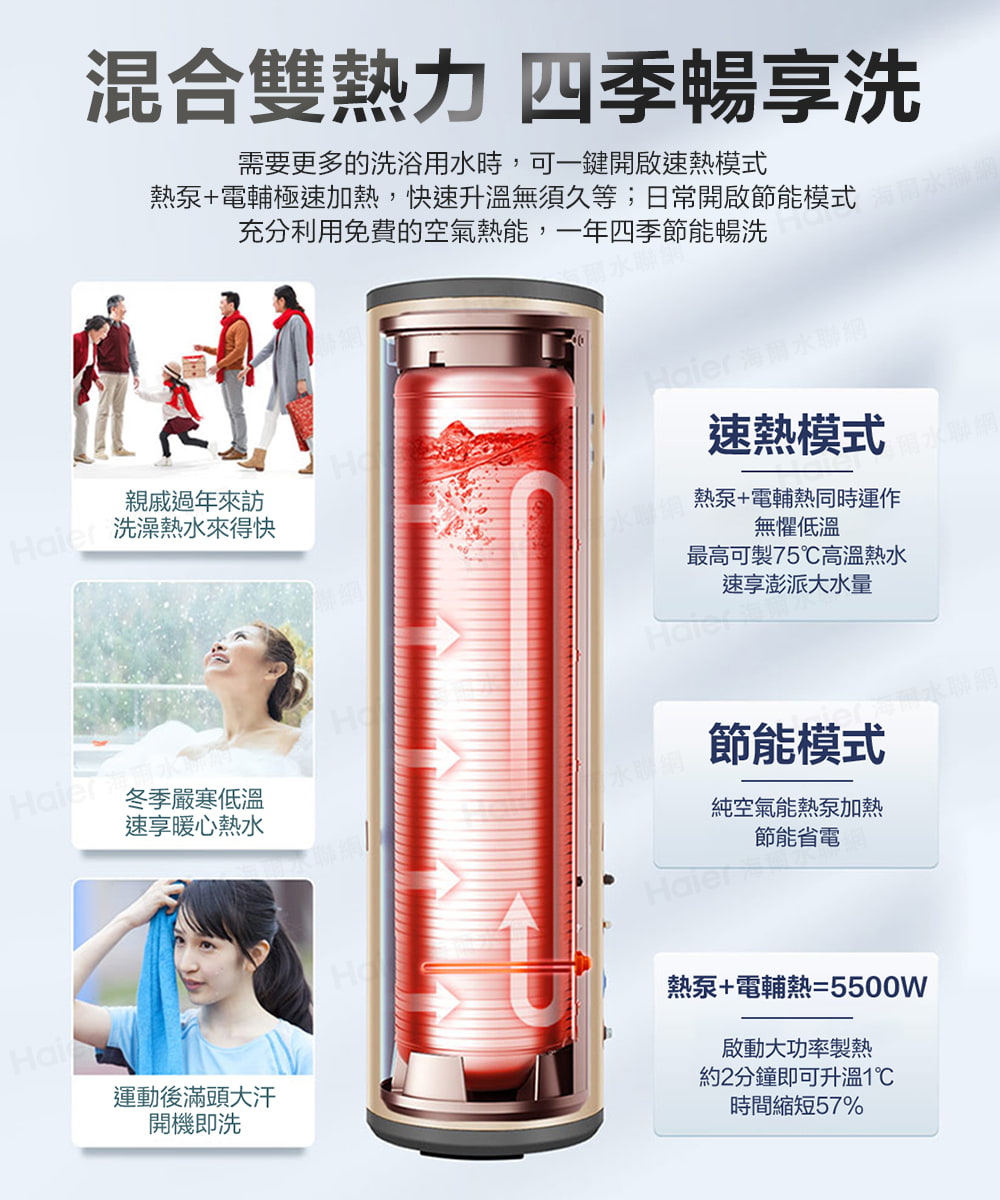 • 混和雙熱力系統:電熱輔助與熱泵雙熱力,節省等待時間