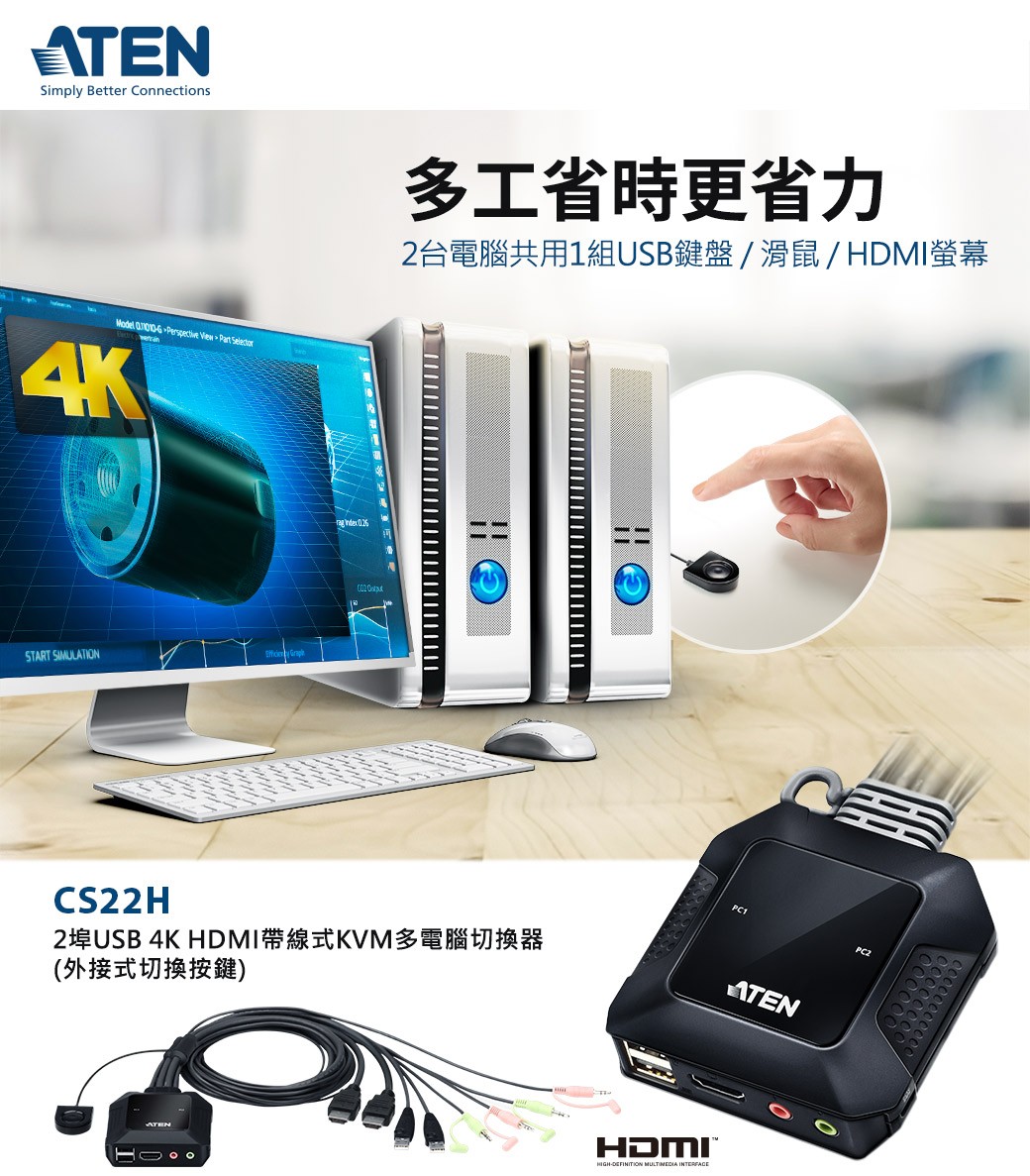 ATEN CS22H 2埠USB 4K HDMI帶線式KVM多電腦切換器 (外接式切換按鍵)