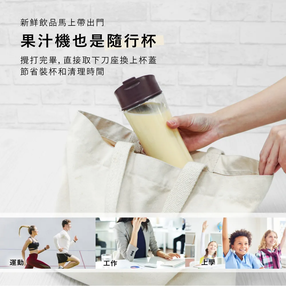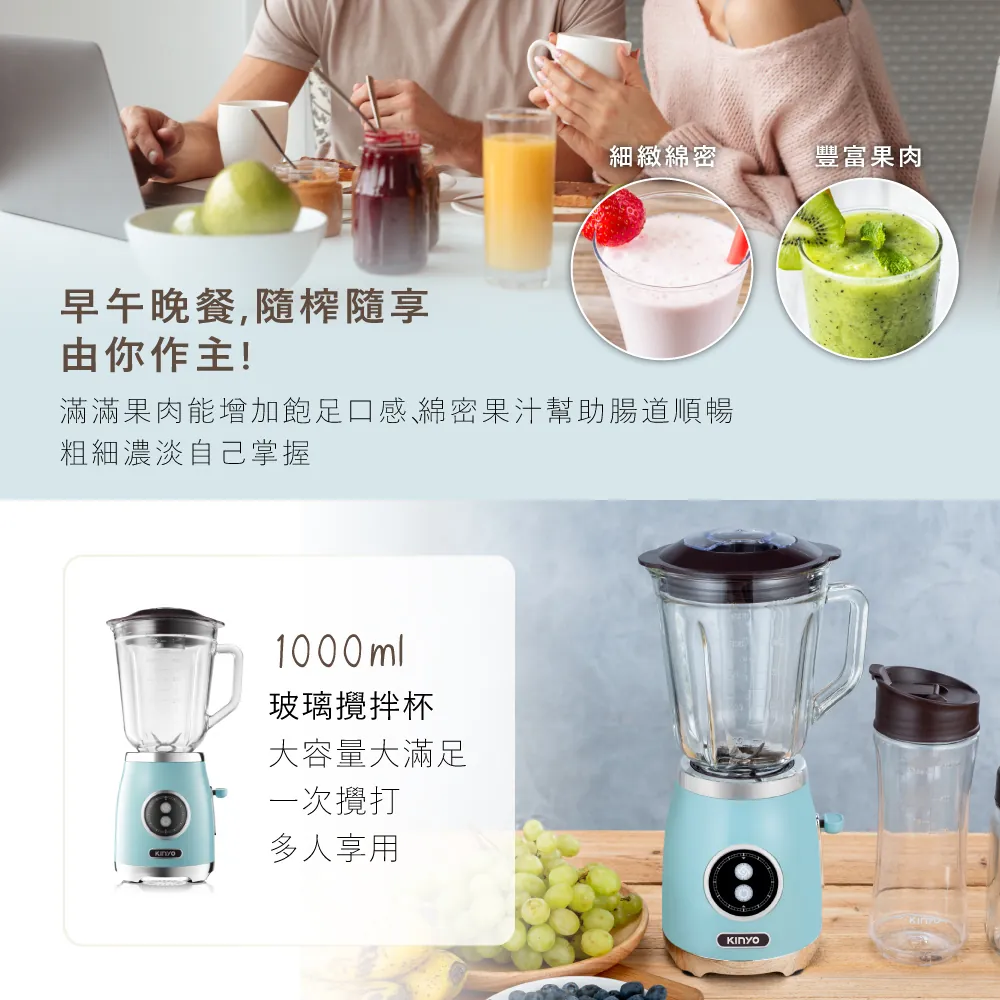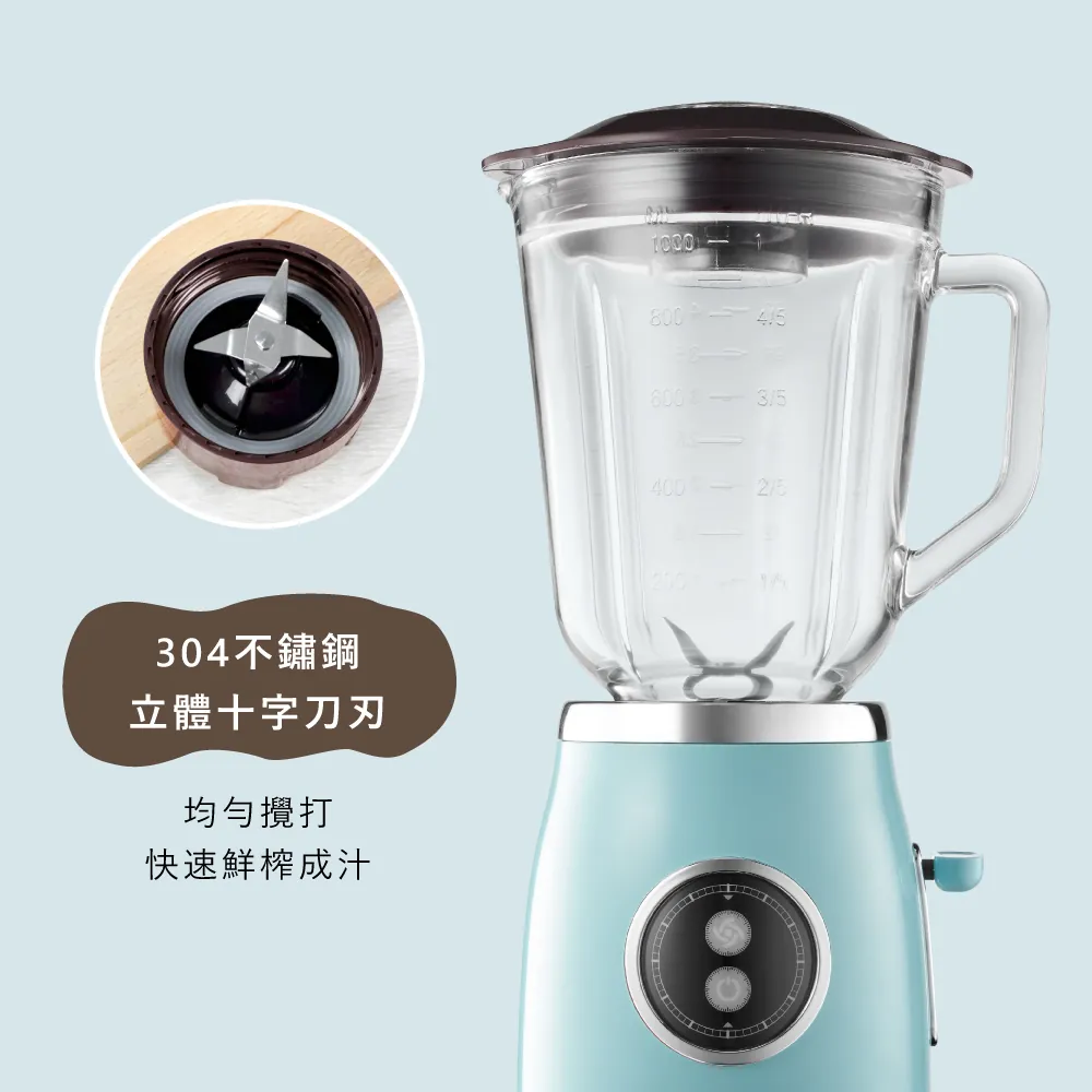 經典輕復古造型,1L大容量玻璃壺果汁機+玻璃/Tritan隨行杯三合一,家用/攜帶各種需求輕鬆滿足。
