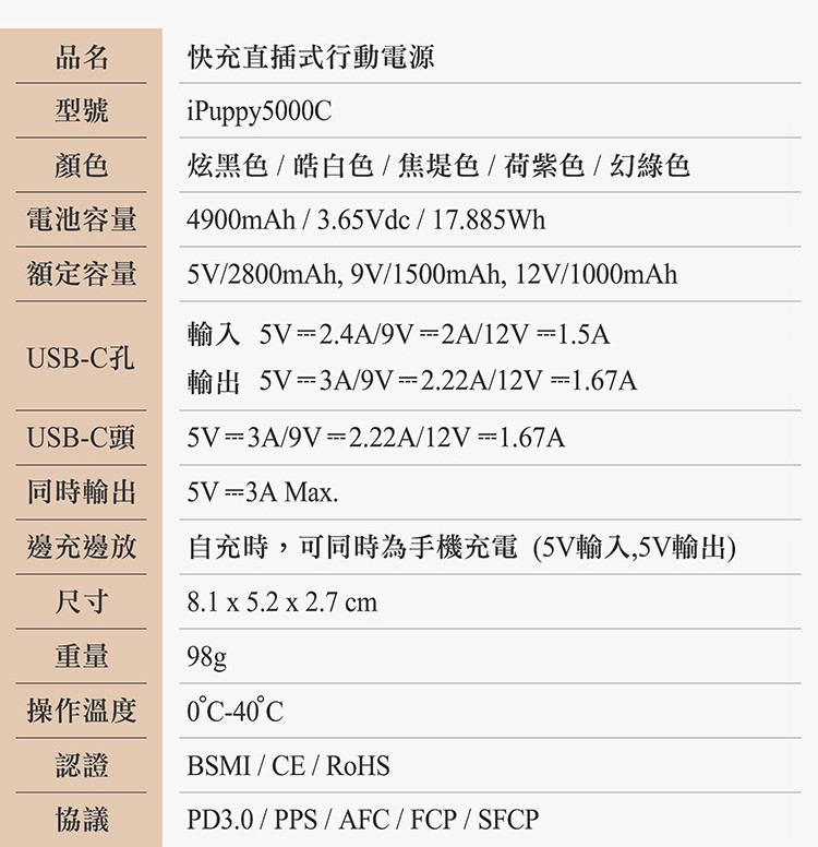 保固1年保固包裝內容快充直插式行動電源 x 1