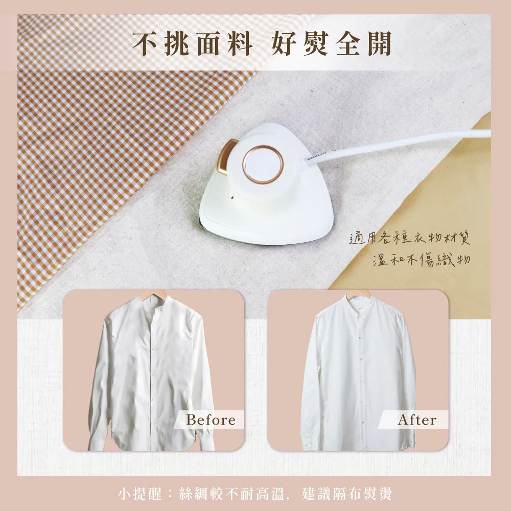 - 穩定發熱體,持續高溫蒸氣輸出,穿透布料撫平皺褶