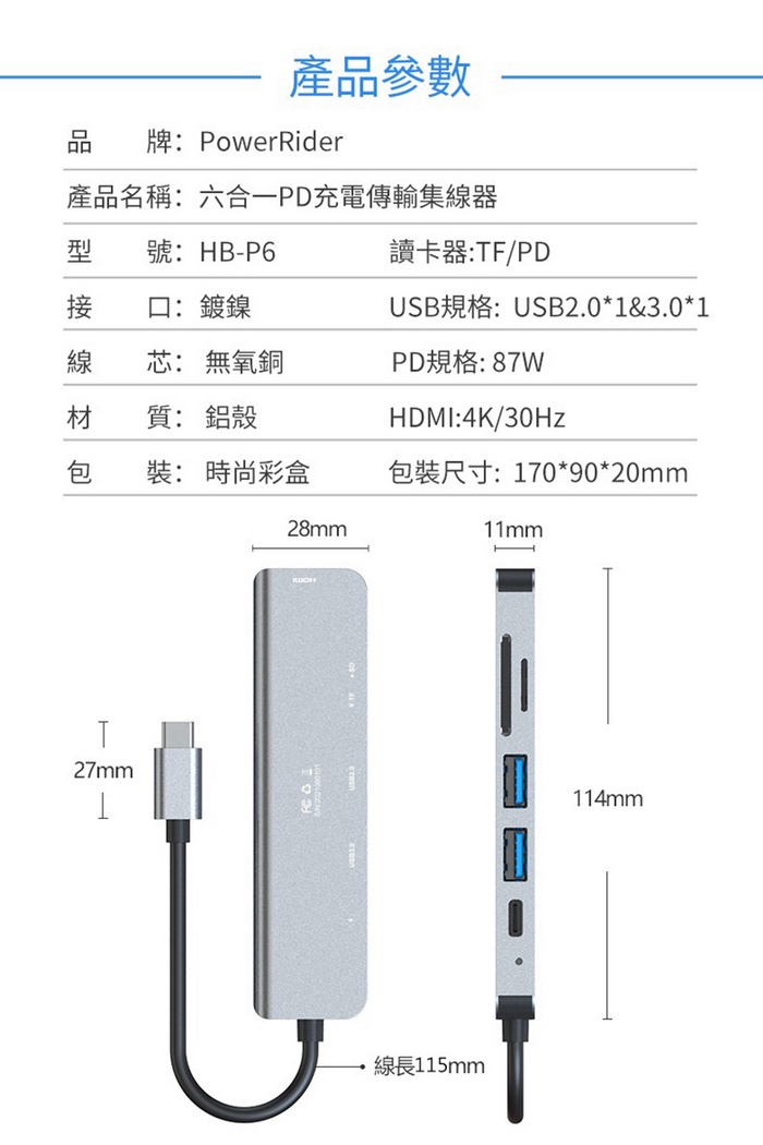 PowerRider HB-P6 4K六合一 充電傳輸集線器