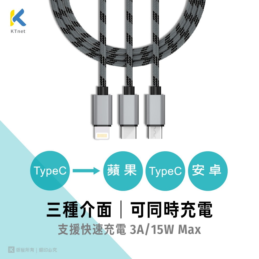 ktnet G40 TypeC 1對3 鋁合金編織充電線1.2M 同時充電 支援QC 3快速充電3A15W 編織線