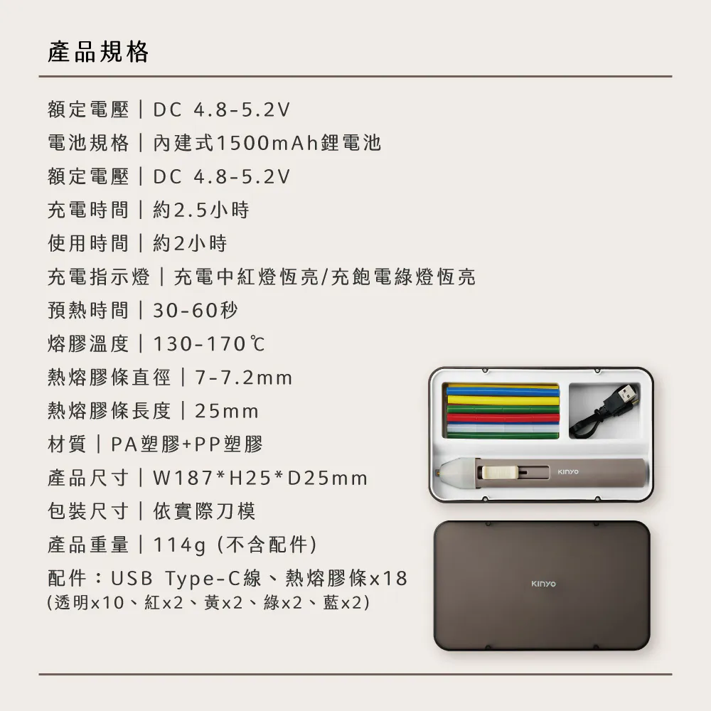 配件:USB Type-C線、熱熔膠條x18(透明x10、紅x2、黃x2、綠x2、藍x2)