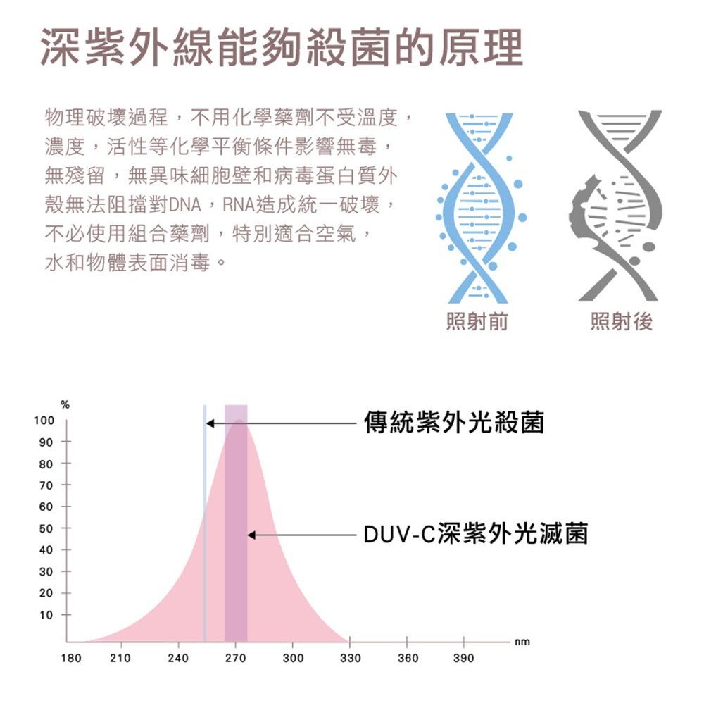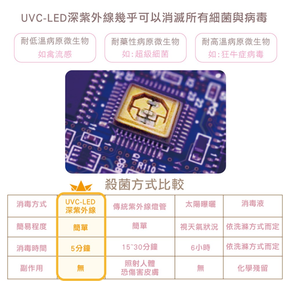 利用UVC-LED深紫外線殺菌殺菌打造一個隨身隱形防護網,減少與病毒細菌的危害接觸,讓我們生活更加安心健康。