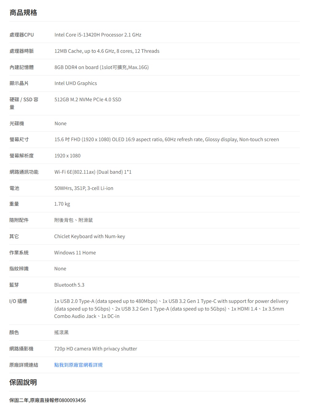 螢幕:15.6吋 FHD OLED (1920x1080) 光面螢幕